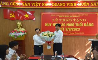 Thay mặt Ban Thường vụ Đảng uỷ Khối Cơ quan và Doanh nghiệp tỉnh, đồng chí Thịnh Đức Tiền, Phó Bí thư Đảng uỷ đã trao tặng Huy hiệu 30 năm tuổi Đảng cho đồng chí Trịnh Duy Nghĩa. Phát biểu tại buổi Lễ, đồng chí Phó Bí thư Đảng uỷ Khối chúc mừng đồng chí Trịnh Duy Nghĩa vinh dự được trao tặng Huy hiệu 30 năm tuổi Đảng và xem đây cũng là niềm vinh dự lớn đối với toàn Đảng bộ đã có những đảng viên ưu tú, nhiều năm cống hiến cho sự phát triển chung của Ngành, cơ quan, địa phương; ghi nhận sự đóng góp sức lực và trí tuệ của đồng chí trong suốt quá trình tu dưỡng, rèn luyện, phấn đấu cho sự phát triển của Đảng, của cơ quan; bên cạnh đó cũng đề nghị đồng chí tiếp tục giữ vững phẩm chất cách mạng, hoàn thành xuất sắc nhiệm vụ Đảng, Nhà nước giao, nêu gương sáng cho đảng viên và quần chúng noi theo.
